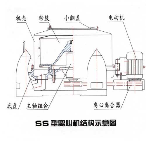 SS型三足離心機由機殼、轉鼓、底盤、吊桿、減震壓簧、配料盒傳動部件、離合器、制動裝置部件組成。轉鼓有裝有摩擦離合器的電機起步輪通過三角帶傳動主軸輪,驅動繞主軸線回轉構成離心力場,當該機運轉正常時,從頂部加料管進入物料,物料在離心力場的作用下,均勻分布于轉鼓內壁,液體穿過離心機網經轉鼓濾孔而泄出,固體則被截留在轉鼓的內壁,當達到分離要求后,關閉電機,制動停機,由人工把物料從該機上部卸出。具有結構簡單、操作方便,通用性強等特點。